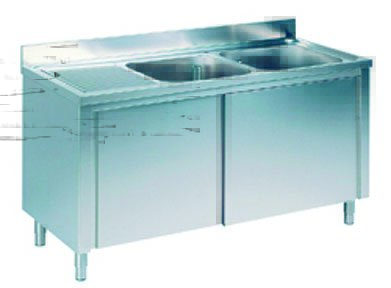 Sink table with sliding doors and ground shelf, two sinks and drain tray.